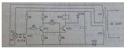 光敏继电器工作原理:220V交流电经过变压器T减压、二极管VD1整流、电容C滤波后作为继电器的直流电源。在T的二次侧另一组6V交流电源直接向发光头EL供电。晶体管VT2、VT3组成射极耦合双稳态触发器。在光线没有照射到接收头光敏晶体管VT1时,VT2基极处于低电位而导通,VT3截止,继电器KA不吸合;当光照射到VT1上时,VT2基极变为高电位而截止,VT3就导通,KA吸合,能准确地反应被测物是否到位。