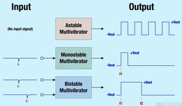 非稳态多谐振荡器(Astable Multivibrator):不需要输入信号来触发(自激)。对于输出信号,有两种状态,但不管哪个状态都不稳定,总是从一个状态转变到另一个状态,一张一弛,所以又称为“多谐振荡器”(Relaxation Oscillator)。单稳态多谐振荡器(Monostable Multivibrator):需要输入信号来触发。触发后,输出信号处于非稳态,但持续一段时间后还是会回到稳态。这种电路可以用于延时、消除抖动等。双稳态多谐振荡器(Bistable Multivibrator):需要输入信号来触发。触发后,输出信号由一个稳态转变到另一个稳态。这种电路是Memory的基础,有待日后分析。