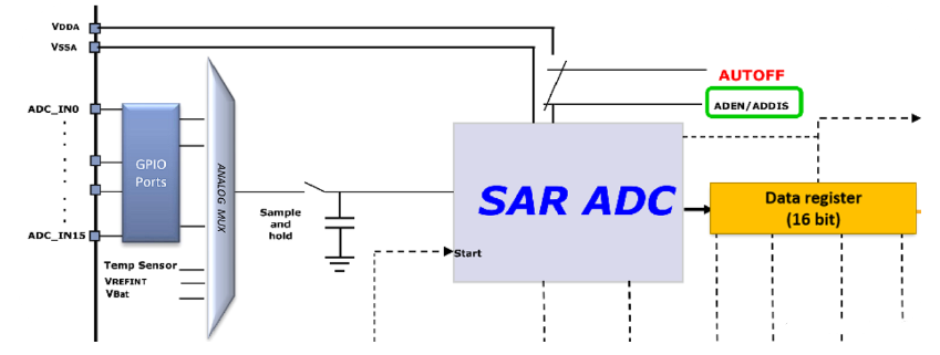 3个内部信号源,分别为内部温度传感 (VSENSE) 输入、内部参考电压 (VREFINT) 输入、外部电池 VBAT 供电引脚输入