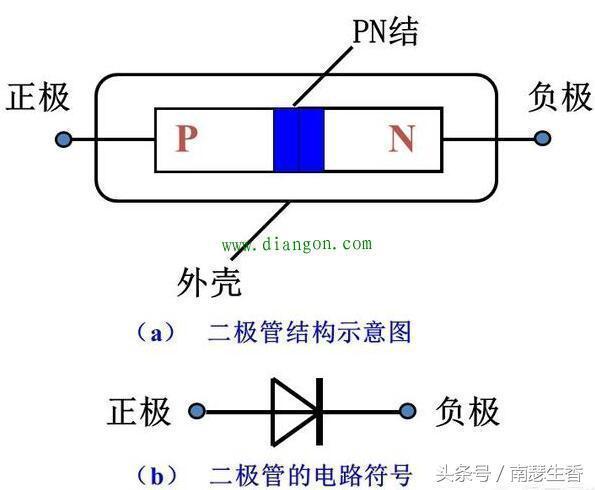 二极管是由PN结组成的,即P型半导体和N型半导体,因此PN结的特性导致了二极管的单向导电特性。PN结如下图所示: