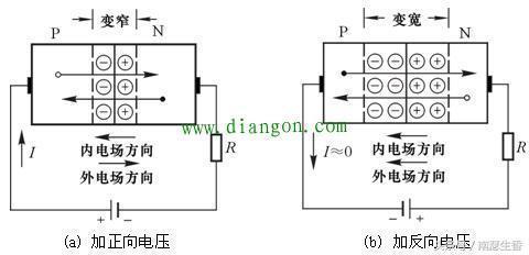 在P型和N型半导体的交界面附近,由于N区的自由电子浓度大,于是带负电荷的自由电子会由N区向电子浓度低的P区扩散,扩散的结果使PN结中靠P区一侧带负电,靠N区一侧带正电,形成由N区指向P区的电场。diangon.com即PN结内电场。内电场将阻碍多数载流子的继续扩散,又称为阻档层。