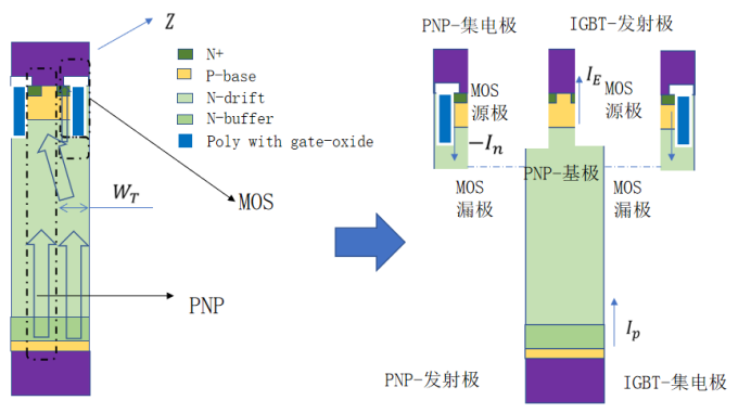 在前面关于PIN&MOS模型分析中,特别强调了这个模型所存在的一个短板,即所有电流都通过MOS沟道,实际上只有电子电流通过MOS沟道,而空穴电流则通过p-base。