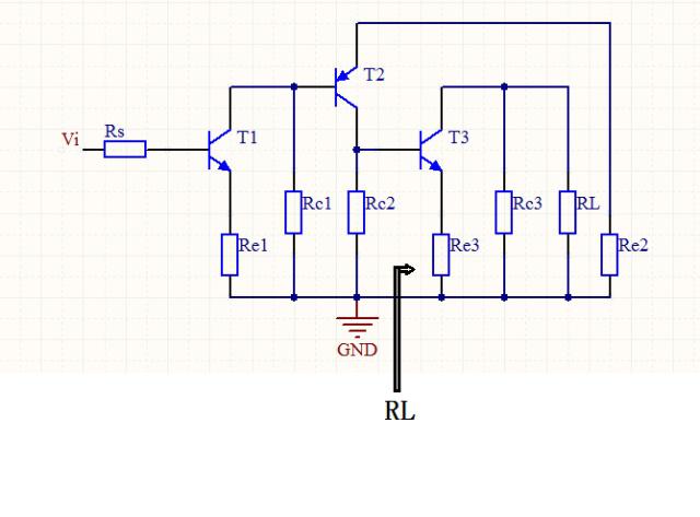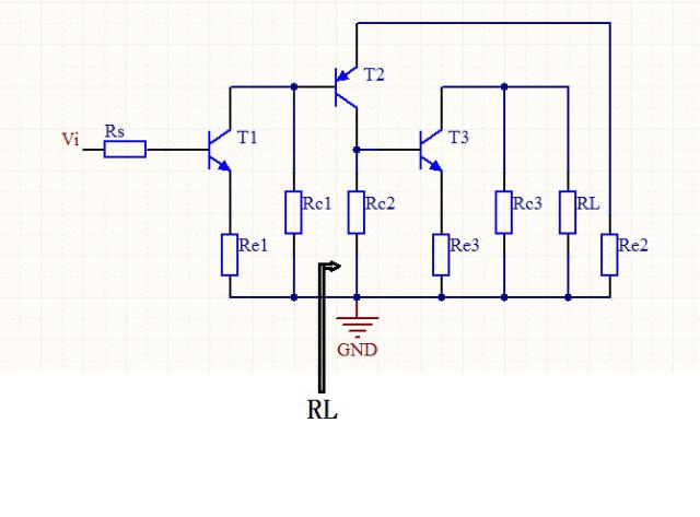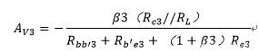 求完第一级第二级就相对来说简单了很多,和第一级一样,如果直接带公式,这里难求的就是R L',R c就是上图中的R c 2,R L代表的就是第三级的输入电阻,求出来是R b b'3+R b' e 3+(1+β3)R e 3,然后代入到公式中求列出了第二级放大电路的公式。