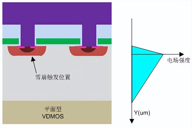 在满足上面的设计条件后,雪崩的触发位置会在元胞电场强度最大的地方。如图5所示,对于平面型VDMOS,为了保证雪崩耐量,芯朋微电子内置高压功率器件的电场最强的地方通常在Pbody的侧下方。