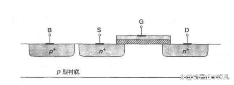 n型MOS(NMOS)器件的简化结构如图2所示。器件制作在p型衬底上(衬底也称作bulk或者body),两个重掺杂n区形成源端和漏端,重掺杂的(导电的)多晶硅区(通常简称poly)作为栅,一层薄SiO2使栅与衬底隔离。器件的有效作用就发生在栅氧下的衬底区。注意,这种结构中的源和漏是对称的。