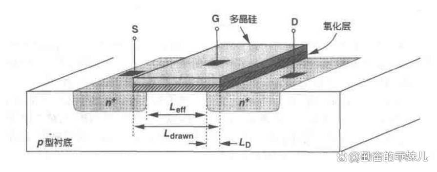 源漏方向的栅的尺寸叫栅长L,与之垂直方向的栅的尺寸叫做栅宽W。由于在制造过程中,源/漏结的横向扩散,源漏之间实际的距离略小于L。为了避免混淆,我们定义Leff=Ldrawn-2L eff,式中Leff称为有效沟道长度,Ldrawn是沟道总长度,而LD是横向扩散的长度。正如在以后我们将会看到的那样,Leff和氧化层厚度tox对MOS 电路的性能起着非常重要的作用。因此,MOS 技术发展中的主要推动力就是不使器件的其它参数退化而一代一代地减小这两个尺寸。后续文章这两个尺寸的典型值为