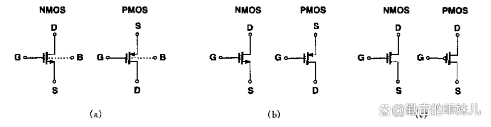 在互补MOS(CMOS)技术中同时用到NMOS和PMOS。从简单的角度来看,PMOS器件可通过将所有掺杂类型取反(包括村底)来实现,如图4(a)所示。但实际生产中NMOS和PMOS器件必须做在同一晶片上,也就是说做在相同的村底上。由于这一原因,其中某一种类型的器件要做在一个“局部衬底”上,通常称为“阱”。现在大多数 CMOS工艺中PMOS器件做在n阱中(图4b))。注意n阱必须接一定的电位,以便 PMOS管的源/漏结二极管在任何情况下都保持反偏。在大多数电路中,n阱与最正的电源供给相连接。为了简化,有时分别称NMOS和PMOS器件为“NFETs”和“PFETs”。