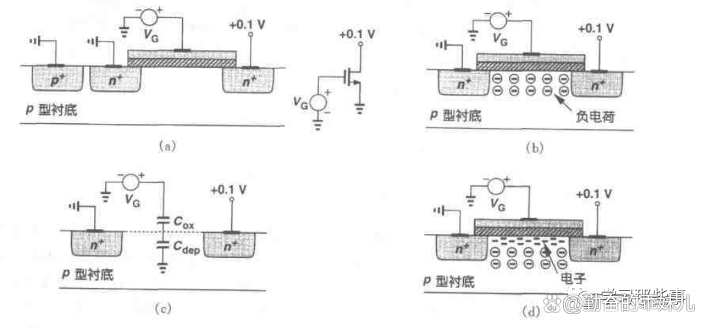 考虑如图1(a)所示的NFET。当栅压VG从0V上升时会发生什么情况?由于栅和衬底形成一个电容器,所以当 VG逐渐升高时,p衬底中的空穴被赶离栅区而留下负离子以镜像栅上的电荷。换句话说,就是形成了一个耗尽层图1(b)。在这种情况下由于没有载流子而无电流流动。