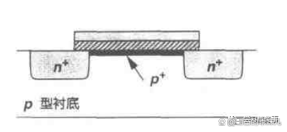 在实际中,由上式得到的“本征”阙值电压可能不适用于电路设计,举例来说VTH=0因而VG≥0时器件不会大断。因此,在器件制造过程中通常通过向沟道区注入杂质来调整阙值电压,其实质是改变氧化层界面附近衬底的掺杂浓度。例如,如图2所示如果形成了p+薄层,那么就需要增加栅压使此区域耗尽。