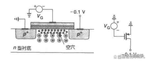 PMOS器件的导通现象类似于NFETs,但是其所有的极性都是相反的。如图3 中所示,如果栅-源电压足够“负”在氧化层-硅界面就会形成一个由空穴组成的反型层,从而为源和漏之间提供了一个导电通道。