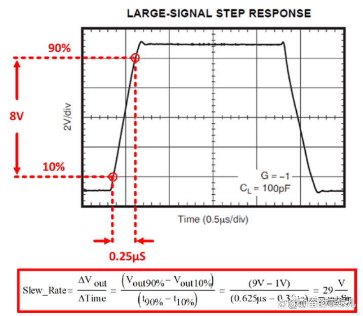 压摆率公式为 SR=ΔVout/Δt。转换速率单位为 V/μs 或伏每秒。见图 1。