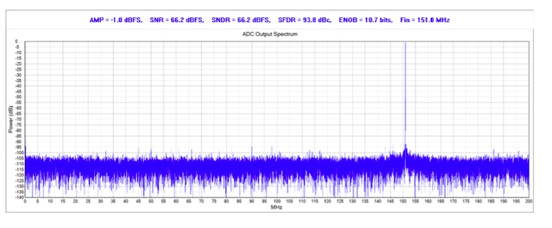 T J =50℃(T A =25℃),AVDD1=0.975V,AVDD2=1.8V,AVDD3=2.5V,DVDD=0.975V,DRVDD=1.8V, Vpp=1.8V,时钟1分频,fs=500M, fin=150MHz, Ain=-1dBFS