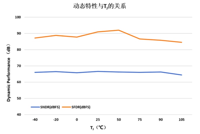 T J =50℃(T A =25℃),AVDD1=0.975V,AVDD2=1.8V,AVDD3=2.5V,DVDD=0.975V,DRVDD=1.8V, Vpp=1.8V,时钟1分频,fs=500M, fin=150MHz, Ain=-1dBFS。动态性能与结温的关系