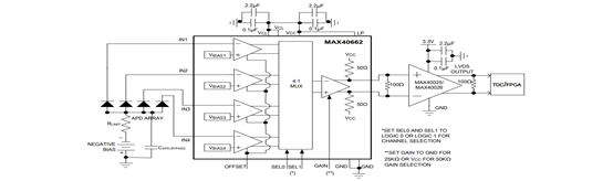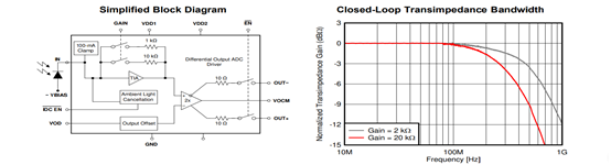 设计用于激光雷达接收机和涉及电流脉冲的相关应用中的光程测量。该元件的传输阻抗是引脚可选的(25和50 kOhm),具有非常低的噪声(2.1 pA /√Hz功率谱密度),这使得该元件非常适合具有低抖动的快速脉冲电流测量。它还包括一个内部多路复用器,带宽额定高达440 MHz,可以轻松支持10 ns的电流脉冲。