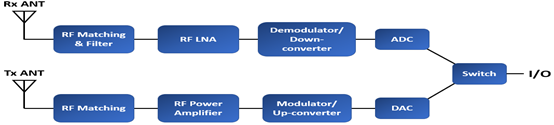 最后,使用天线开关在信号链的Rx和Tx支路之间交换。在具有MIMO的系统中,将使用多个天线开关将信号发送到Tx(Rx)线上的不同放大器级,并且将在开关级的上游(下游)执行调制(解调)。