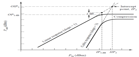3阶拦截点(OIP3)适用于任何调频信号,并与1 dB压缩点有关。该规格在Tx侧的功率放大器中变得很重要,因为这些放大器通常在非常接近饱和的状态下工作。放大器的非线性特性将产生互调产物,其中三阶产物是最重要的。在饱和状态下的某些输入功率下,三阶乘积将外推到与所需边带相同的强度。