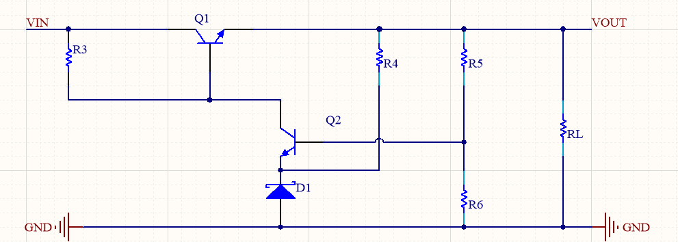 这个电路中三极管Q1是一个调整电压的管子,它的基极是由三极管Q2的集电极进行控制;三极管Q2在这个电路中是作为比较放大的一个模块;电阻R3是三极管Q2的集电极负载电阻;稳压管D1和电阻R4两个器件构成了基准电压,电阻R5和电阻R6两个利用分压比构成了VOUT端的电压采样回路。