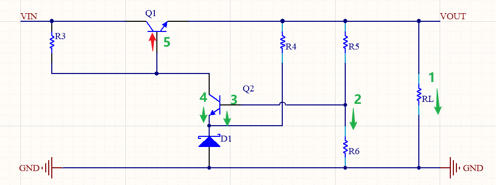 这幅图的情况和上图的情况相反,表示为当VOUT处的电压降低时此电路中各个节点的电压变化情况。后面为具体分析:当VOUT也就是图中1处的电压下降时,2处的两电阻之间的分压会跟着降低,进而图中3处也就是三极管Q2的基极电压降低,导致三极管Q2的β值降低,放大倍数减小,接着三极管Q2的集电极与发射极之间的电流4减小,也有可能三极管Q2的发射极电压很低不足打开稳压管,此时三极管Q1的基极电压就会动态升高,进而三极管Q1的发射极电压就会被钳位升高,以抵消端口VOUT处的电压跳动。