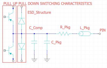 1.输出结构,包含一个PMOS、一个NMOS、两个ESD保护二极管、芯片的电容和封装寄生参数:C_PKGR_PKGL_PKG是整个芯片的等效电容、电阻、电感特性,C_Comp为硅片上脚的压焊盘电容。