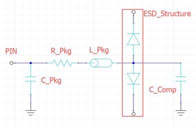 2.输入结构,包含两个ESD保护二极管、芯片的电容和封装寄生数:C_PKGR_PKGL_PKG是整个芯片的等效电容、电阻、电感特性,C_Comp为硅片上脚的压焊盘电容。