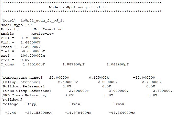 3.模型数据,模型对应的Pulldown、Pullup、Power_Clamp、Gnd_Clamp的IlV数据表;Ramp数据;描述波形上升/下降沿的VIT数据表等