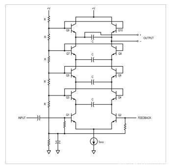 总结穆格滤波器的行为如下(见图8):偏置电流设置晶体管的静态点,该电流在阶梯的两侧共享。忽略反馈,左侧的输入电压驱动通过分支的小信号电流。分支之间的差分信号在电容器之间产生电位差,允许滤波发生。一种方法是晶体管的跨阻抗产生带有电容器的RC滤波器。