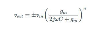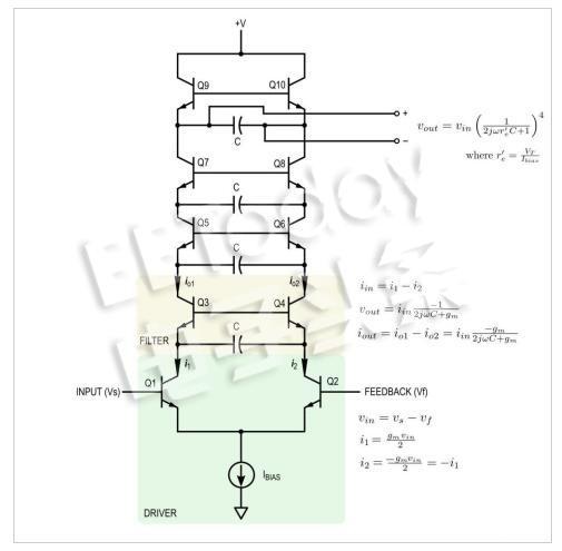 对于晶体管偏置(驱动)电流IC,我们假设高β。对于中间滤波器级,输出电流gmvout输入到下一部分的输入电流。这个电流是:
