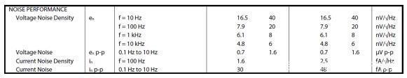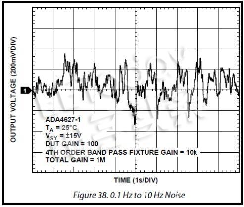 运算放大器是ADI公司的ADA4627。ADA4627引起了对ADI公司低噪声运算放大器选择表快速扫描的注意。它具有低噪声、支持±5V至±15V的电源电压。然后,检查数据表显示噪声已明确指定。它没有被选中,因为数据表规格与LTspice测试相符或不相符。以下是ADA4627数据表的噪声部分。左栏是B级部件,右栏是A级部件。下面的比较表显示规格。