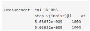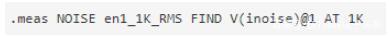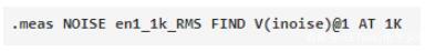 噪声:将测量应用于噪声模拟;en1_1k_RMS:只是结果的名称,用于日志文件;FIND :指定测量,在这种情况下只是获取数据值;V(inoise)@ 1:用于测量的数据集,详情如下;AT 1K:选择数据的频率。