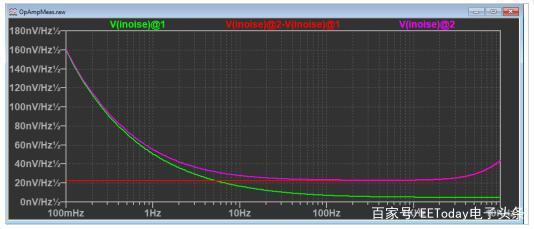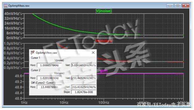 以下是解释V(inoise)或输入参考噪声电压密度的图表。V(inoise)、V(onoise)和增益显示在单独的窗口中。V(inoise)和V(onoise)的测量光标位于1kHz。将输出噪声V(onoise)除以V(inoise)的电路增益为50. V(inoise)是运算放大器的输入噪声,因为所有电阻都是无噪声。