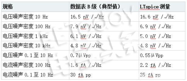V(inoise)需要解释。V(inoise)是返回输入的整个电路的输出电压噪声。这是由LTspice针对每个噪声模拟计算的。这将在下面进一步解释。请记住噪声源以RMS方式加减。当一个噪声源比另一个噪声源大时,它开始完全占主导地位。通过在源之后添加“@ 1”或“@ 2”来选择特定.STEP运行的数据。例如,“@ 1”表示使用小输入电阻运行。来自.MEAS语句的数据可在Spice错误日志中找到。下表是将数据表值与测量值进行比较的表格。