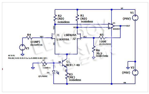 双JFET是Linear Integrated Systems的LSK489。选择此部分是因为它位于标准LTspice库中,并且是一种噪声非常低的器件。因为数据表规范与LTSPICE测试不匹配,所以没有选择它。