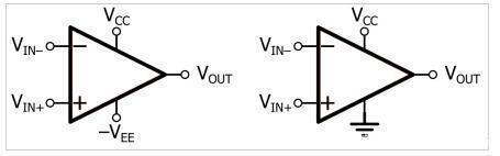 双电源运算放大器电路(左)和单电源配置(右)表示电源和接地引脚