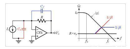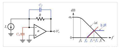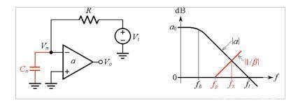 β(j)的极点频率 p的是零频率1 /β(j),表明|1 /β(j)| 曲线开始上升 p。如果 p与交叉频率 X相比足够低,ROC将接近40分贝/ dec,表示相位裕度趋近零。用于对抗由C n引起的相位滞后的常见解决方案是通过R上的反馈电容C f引入相位引线,如图 3(a)所示。