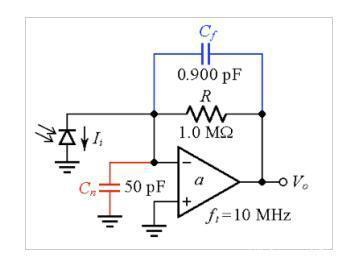 入射光使光电二极管吸收小电流(高达几微安),然后运算放大器转换为可用电压。假设运算放大器具有10 MHz的恒定增益带宽积,并假设总杂散输入电容(二极管的结电容与运算放大器、电路元件和电路走线的杂散电容之和)为50 nF。的值通过方程式(8)得到。从假设C = 0开始,得到