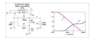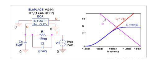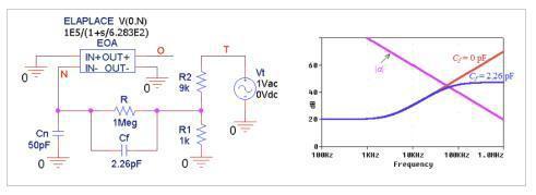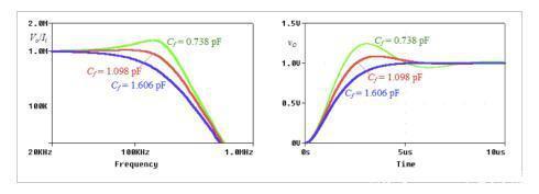上述示例表明C f的值相当小,通常在皮法拉或甚至亚皮法的范围内。这样小的值可证明在物理上是不切实际的,因此我们从一个更实际的值开始,如 = 10pF,然后我们迫使运算放大器来驱动经由分压器按比例下降到(较小的)期望值。图12描绘了φ m = 45.0°的情况。