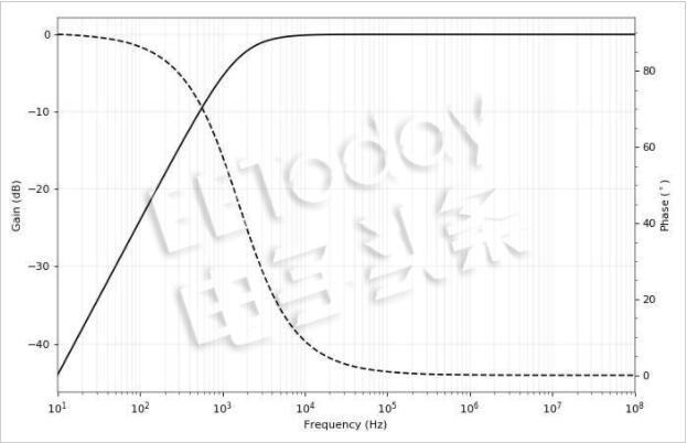 在这种情况下,相移从+ 90°开始,滤波器是高通滤波器。超过截止频率,我们最终稳定到0°。因此,我们看到串联电容总是会在+ 90°和0°相移之间产生影响。