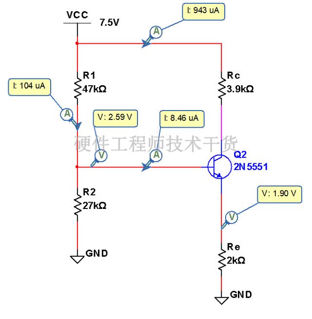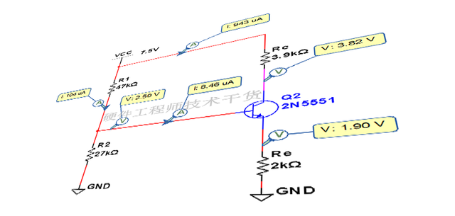以上参数都是计算值,根据实际情况,电压源调整为7.5V常用电压源,Rc调整3.9K常用电阻。电压源调整,偏置电路需要重新计算,才能保证Ub约为2.7V。