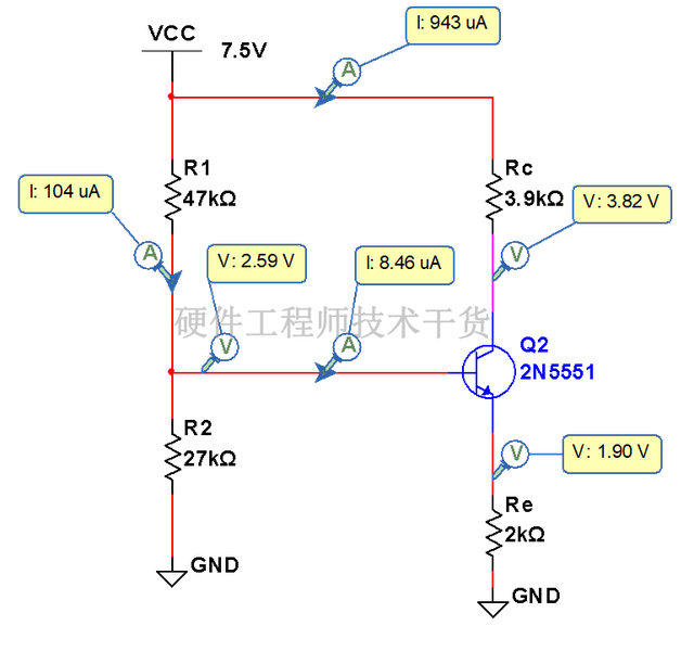 如下电路图,电路没有输入输出信号,三极管Uce电压比较大,说明三极管并未完全导通。基极有很小电流Ib=8.5uA,集电极电流Ic=943uA,电流放大倍数约为110倍。