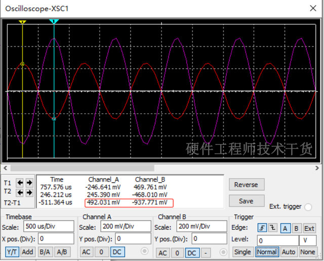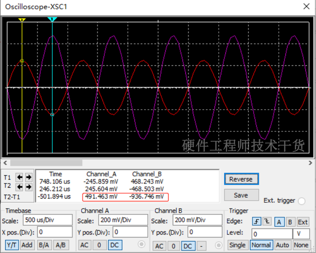 现在我们增加输入信号,这里是1KHz,峰峰值500mV信号,测量输出波形相位相反,幅值增大,如下:注意图中的黄色标签为动态参数请忽略。
