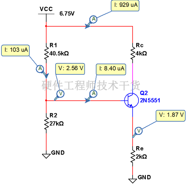 仿真结果显示,Re压降并不是设定值2V,Ub也是不是2.7V,Ic也不是1mA,但是都比较接近。这是由于以上计算都是基于基极电流Ib太小忽略不计得出的。