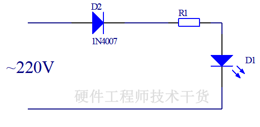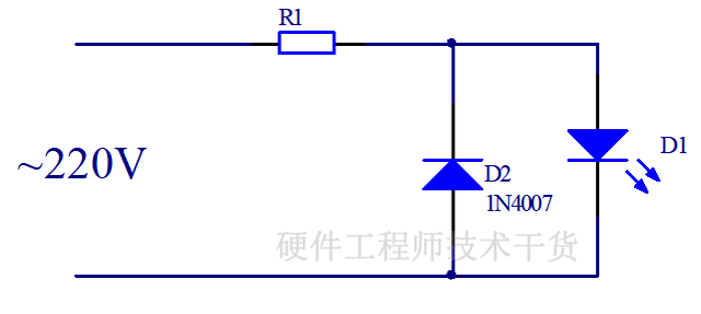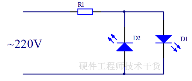 图1这种电路成本最低,但是设计不合理,发光二极管反向截止时要承受220V电压,峰值反向电压达到220V*1.414 = 311V,有反向击穿风险。虽然有设计缺陷,但是市面经常能看到这种电路设计,比如热得快、电热毯等指示灯。