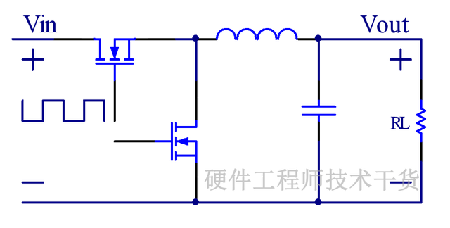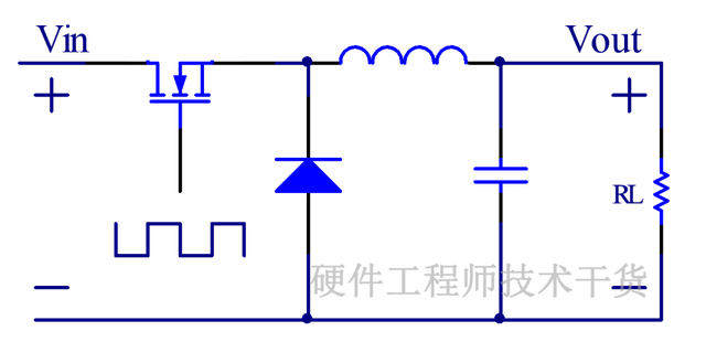 DCDC拓扑之一BUCK电路,是一种降压类型电路,用途非常广泛,拓扑图如下,主要元器件包括开关管、电感、续流二极管、滤波电容。控制开关管导通与关闭实现电源降压,这是异步BUCK,如果把二极管更换为开关管,则是同步BUCK,同步BUCK发热量小效率高。