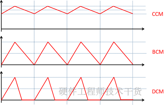 根据一个开关周期内电感的电流是否连续,BUCK电路分为三种工作模式:连续模式(CCM)、临界模式(BCM)、断续模式(DCM),如下图所示: