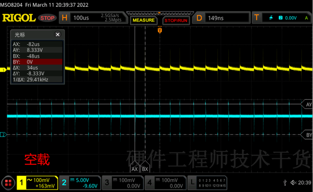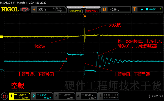 空载时开关管三四十微妙开关一次,放大后波形如下,上面开关管导通了500ns后关闭,下面的开关管导通SW下降为0电位,电感电流下降到0之后SW出现振荡,最终稳定在5V和输出电压相同。