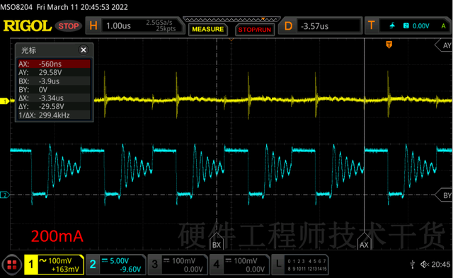 负载从50mA,增加到280mA,这个片子一直在缩短空闲时间,来保持输出电压稳定。上管导通时间几乎没有变化500ns左右。