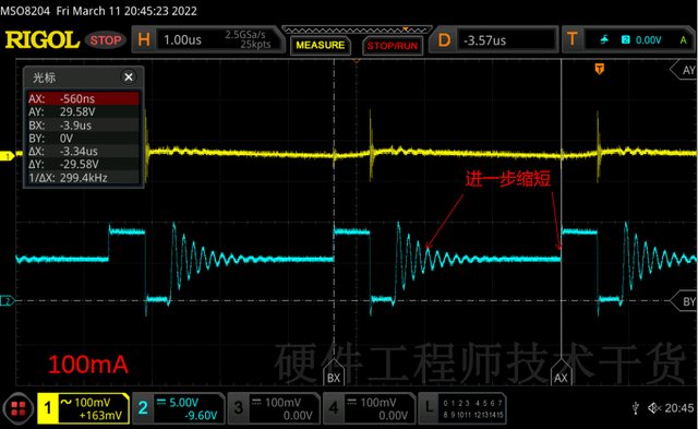 使用电子负载增加50mA,相比空载空闲期缩短了,如下图。