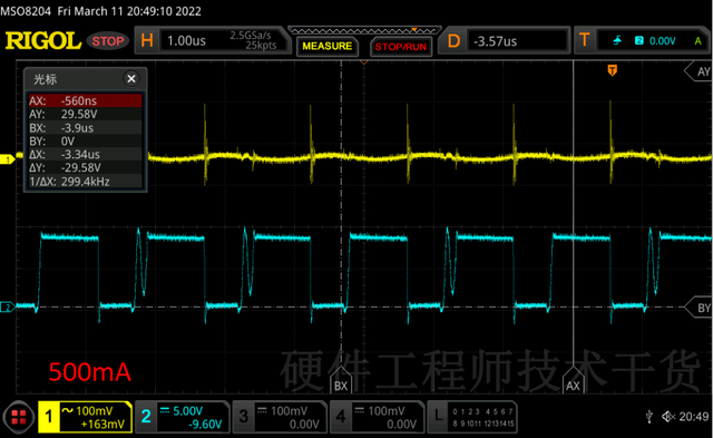 负载增加到500mA,部分周期内振荡消失,这就应该是BCM临界模式。随着负载增加,这个片子中上管导通时间增加到了800ns左右,开始延长导通时间增加输出能力。
