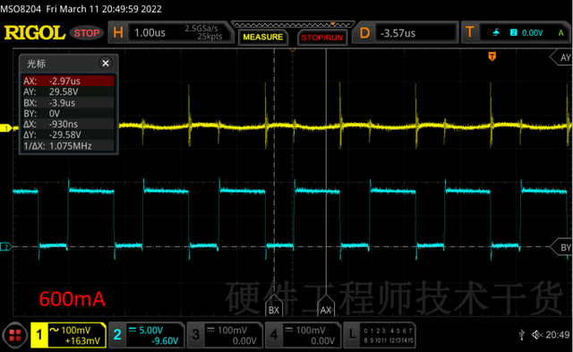 负载增加到600mA,振荡全部消失,进入CCM连续模式。上管导通时间增还是800ns左右
