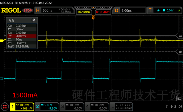 以下是负载增加到1000mA以及1500mA的截图,除了输出纹波变大了,SW波形变化不明显。上管导通时间增还是800ns左右。
